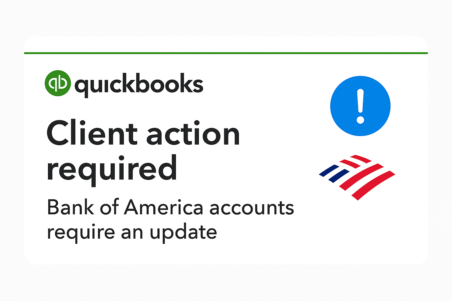 Bank of America is updating bank account connections in QuickBooks Online. All current clients with an active Bank of America connection must update their connection in QuickBooks to stay connected. Otherwise, their Bank of America [...]