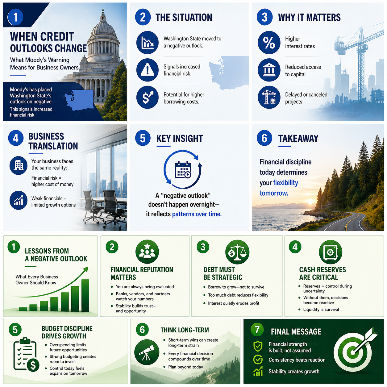 From a financial and forensic accounting perspective, this situation offers a clear and practical lesson for business owners. The same principles that impact a state’s creditworthiness apply directly to the financial health and sustainability of any organization, regardless of size.